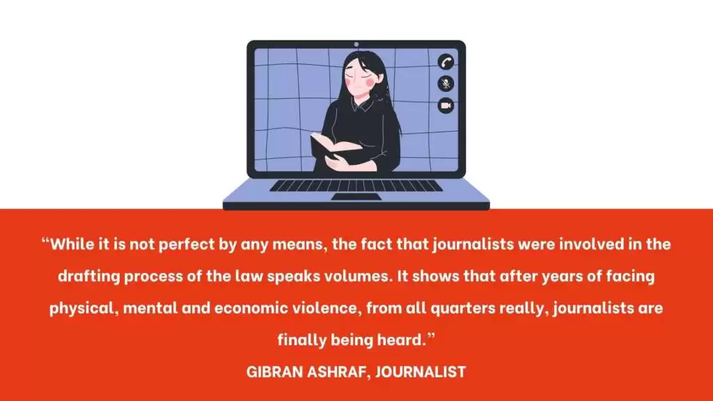 Gibran elaborates, “Sindh has seen some of the most brutal cases of violence against journalists, including the abduction and murder of Wall Street Journal journalist Daniel Pearl. I have personally lost colleagues and friends including Wali Khan Babar and Arif Khan. Other colleagues too faced violence from different quarters. I have faced my share of threats and intimidation. Some of my colleagues have reported being harassed; unfortunately, some by coworkers, others by state entities. So some of the provisions in the bill regarding harassment, protecting journalists from state and non-state entities – especially in the online and digital space – are very welcome.”