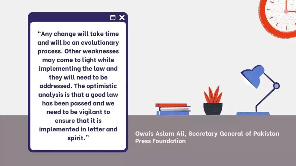 “Any change will take time and will be an evolutionary process. Other weaknesses may come to light while implementing the law and they will need to be addressed. The optimistic analysis is that a good law has been passed and we need to be vigilant to ensure that it is implemented in letter and spirit,” Owais states. He also points out that the Act recognises journalists’ right to professional privacy and undertakes to implement the United Nations Plan of Action on the Safety of Journalists and the Issue of Impunity.