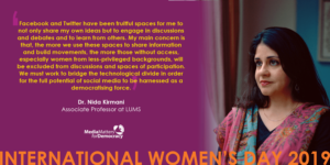 Dr.Nida Kirmani is an Associate Professor of Sociology at LUMS. While social media has allowed her to be vocal on different issues, she feels that the lack of internet access to many women is creating disconnect and needs to be addressed on a priority.