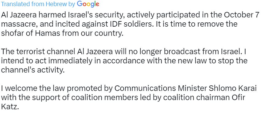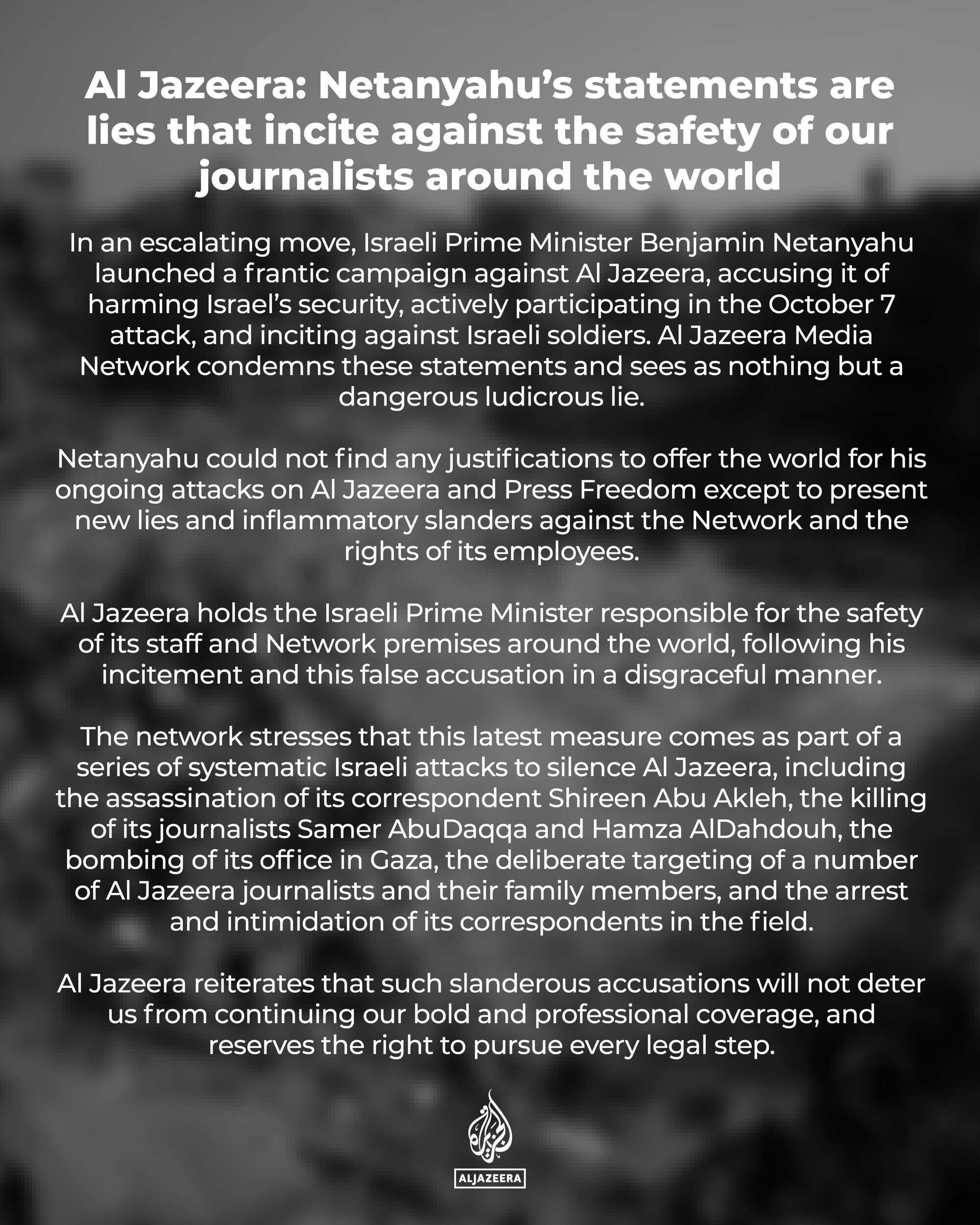 “Netanyahu could not find any justifications to offer the world for his ongoing attacks on Al Jazeera and press freedom except to present new lies and inflammatory slanders against the Network and the rights of its employees,” Al Jazeera said. “Al Jazeera reiterates that such slanderous accusations will not deter us from continuing our bold and professional coverage, and reserves the right to pursue every legal step.”