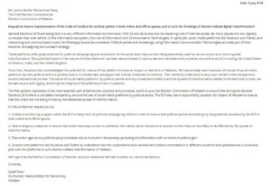It requests the ECP to initiate a special cell to monitor the election campaigns in online spaces to ensure that political parties are abiding by the CoC and to connect with platforms like Facebook and Twitter to understand how corporations have worked globally with other elections commissions of the world. Read the letter here