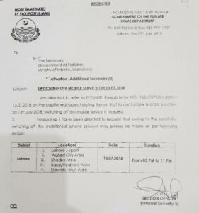 The Punjab home department wrote a letter to the federal Interior Ministry on Thursday to request switching-off mobile services in selected areas of Lahore from 3pm to 11pm, on the day former Prime Minister Nawaz Sharif and his daughter Maryam Nawaz Sharif are scheduled to land at the Allama Iqbal International Airport in Lahore.