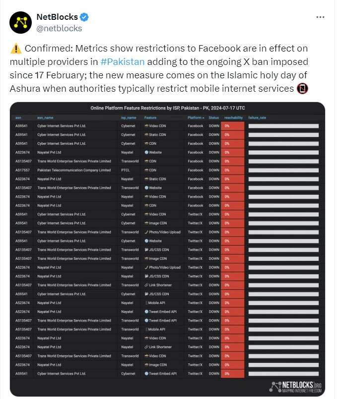 A number of users were unable to access their Facebook accounts on July 17, which marked the religious holiday Youm-e-Ashura (Muharram 10). According to NetBlocks, the restrictions were in effect on multiple service providers in the country.