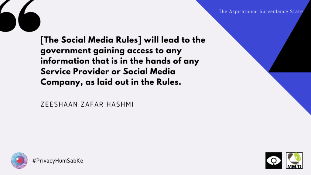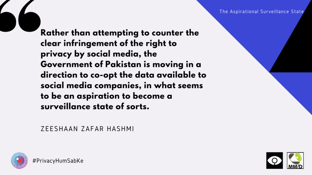 Rather than attempting to counter the clear infringement of the right to privacy by social media through introducing a personal data protection law in accordance with Article 14 of the Constitution of Pakistan, 1973 which guarantees the rights to dignity and privacy, the Government of Pakistan is moving in a direction to co-opt the data available to social media companies, in what seems to be an aspiration to become a surveillance state of sorts. This is clear from the recent promulgation of the Removal and Blocking of Unlawful Online Content (Procedure, Oversight and Safeguard) Rules, 2020, or the Rules, in November 2020.