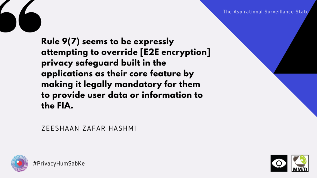 The major implication of Rule 9(7) is that now, service providers and social media companies such as Facebook, WhatsApp, Instagram, and the like are obliged to share any data and information they hold, including messages containing private conversations, search histories, and any other encrypted user data with the Federal Investigation Agency (FIA), which is the investigation agency notified under section 29, PECA. This is particularly worrying with respect to messaging applications such as WhatsApp, Signal, and Telegram, which claim to be end-to-end encrypted, and to themselves be unable to read or listen to conversations taking place on their applications. Rule 9(7) seems to be expressly attempting to override this privacy safeguard built in the applications as their core feature by making it legally mandatory for them to provide user data or information to the FIA.