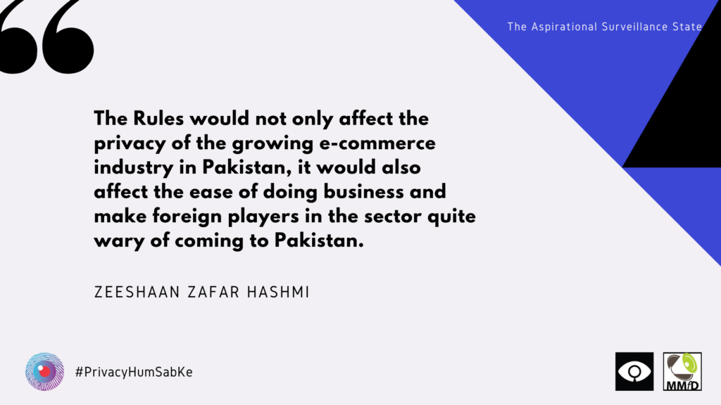 In addition to messages regarding private conversations, the FIA will also be empowered to obtain any data pertaining to e-commerce. In this context, it is pertinent to note the growth of e-commerce in Pakistan, particularly during the COVID-19/Coronavirus pandemic. Daraz.pk, which is one of the largest e-commerce sites active in Pakistan, estimates that there has been a nearly 70% increase in e-commerce since the pandemic struck in March 2020, particularly with respect to fast moving consumer goods. Therefore, the Rules would not only affect the privacy of the growing e-commerce industry in Pakistan, it would also affect the ease of doing business and make foreign players in the sector quite wary of coming to Pakistan, especially global e-commerce giants such as Amazon and PayPal which have still not entered the Pakistani market due to the unfavourable regulatory environment.