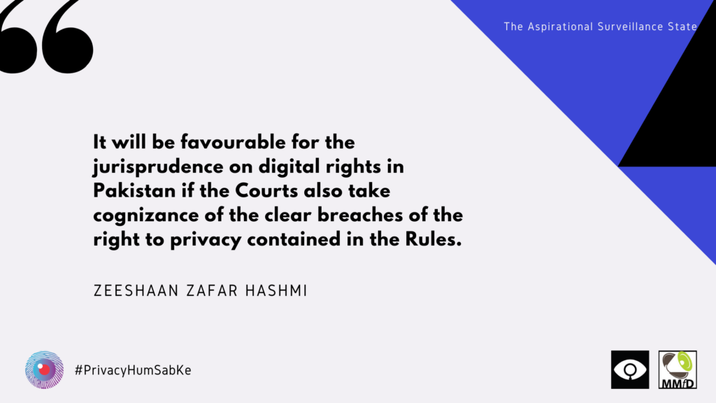 However, it will be favourable for the jurisprudence on digital rights in Pakistan if the Courts also take cognizance of the clear breaches of the right to privacy contained in the Rules. The recent trend of the Pakistani judiciary to adjudicate on privacy rights, and take into account case law and jurisprudence of a number of jurisdictions as seen in Ghulam Mustafa’s case and Justice Isa’s case is promising in this regard. Certainly, Rule 9(7) would seem to infringe the rights to privacy of information and communications as delineated by the Global Internet Campaign and cited with approval in Ghulam Mustafa’s case. The judgement in Ghulam Mustafa’s case extensively cited the judgement of the Indian Supreme Court in K.S. Puttaswamy v. Union of India which also greatly stressed the concepts of communicational and informational privacy despite the fact that there is no explicit right to privacy guaranteed in the Indian Constitution unlike the Pakistani Constitution.