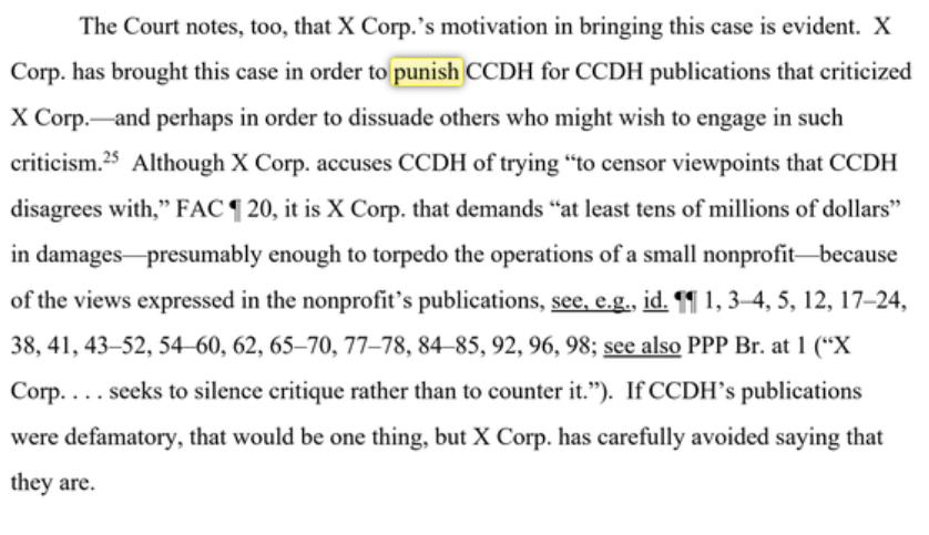 Musk thought CCDH’s research would scare away advertisers by showing the platform in a negative light, according to the judge. He added Musk’s X Corp is more concerned about the speech at the nonprofit than it is about its data collection methods. By demanding “tens of millions of dollars” in damages for reputational harm, X Corp attempts to “torpedo” the operations of a small nonprofit because of the views expressed in the organisation’s reports, the ruling says.